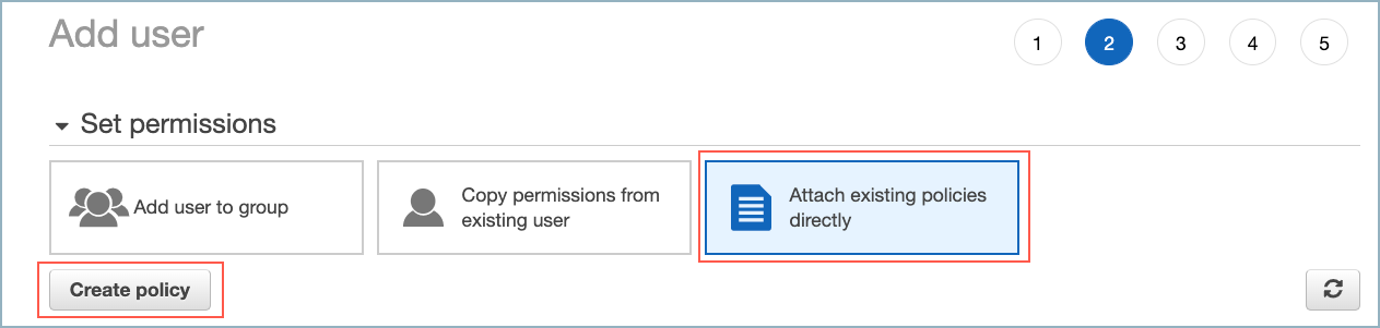 On the Set permissions dialog, select Attach existing policies directly.