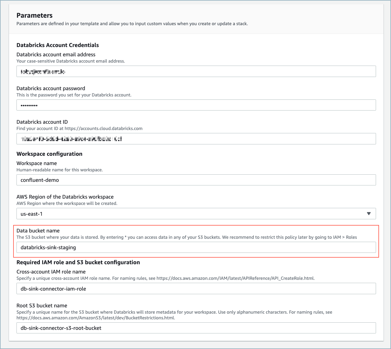 Complete the Quick create stack web form. Databricks pre-populates most of the required fields. Be sure to enter a Data bucket name. You will use this name when creating the S3 bucket in AWS.