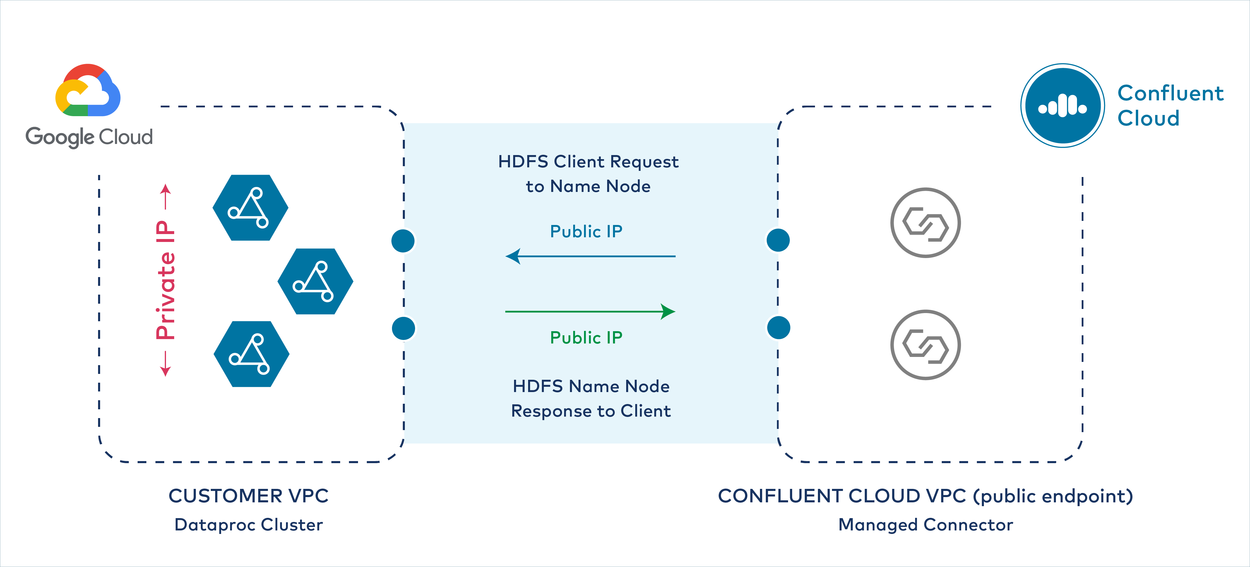 When Confluent Cloud is set up with public endpoints in a non-VPC peering environment, connector requests originate from a public IP endpoint at the Confluent Cloud VPC where the Dataproc connector is running. However, the Dataproc cluster VPC does not provide a public IP address endpoint. Even if each Dataproc node has a Public IP address configured, the VPC does not, and the Hadoop daemon returns private IP addresses and private hostnames to the Confluent Cloud connector.