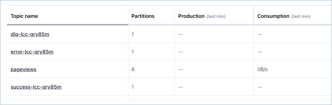 The suffix for each topic name is the connector’s logical ID. In the example below, there are the three connector topics and one pre-existing Kafka topic named pageviews.