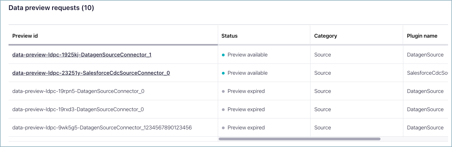data-preview-ldpc-<id>(in your Kafka cluster). This topic is deleted when you click the delete icon next to the preview listing.