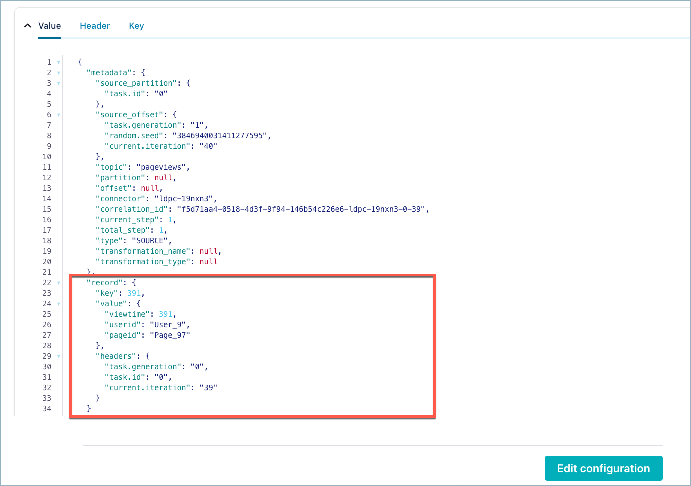 The record section shows the actual data that is sent to the topic when the connector is running. Note the following additional details when viewing preview data: