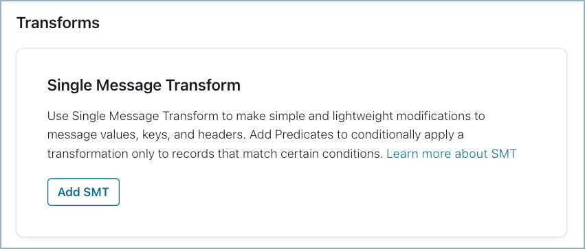 Confluent Cloud fully-managed connectors can be configured with one or more single message transforms (SMTs) to make simple and lightweight modifications to message values, keys, and headers. This can be convenient for inserting fields, masking information, event routing, and other minor data adjustments. SMTs can be used with sink and source connectors.