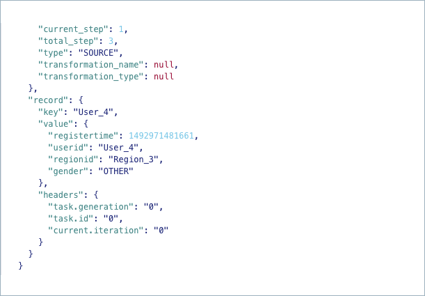 The first record is the actual source record received by the connector. No transformations are applied yet.