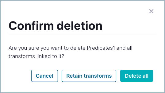 When you create a predicate, the predicate is linked to the first transform it was created from. You can link additional SMTs to use the same predicate. When you delete a predicate, you have the option to keep transforms linked to the predicate, or delete the predicate and any linked transforms.