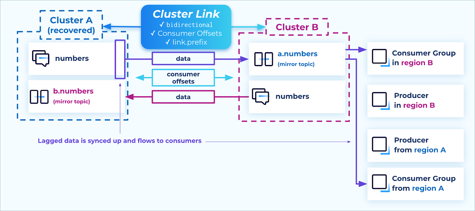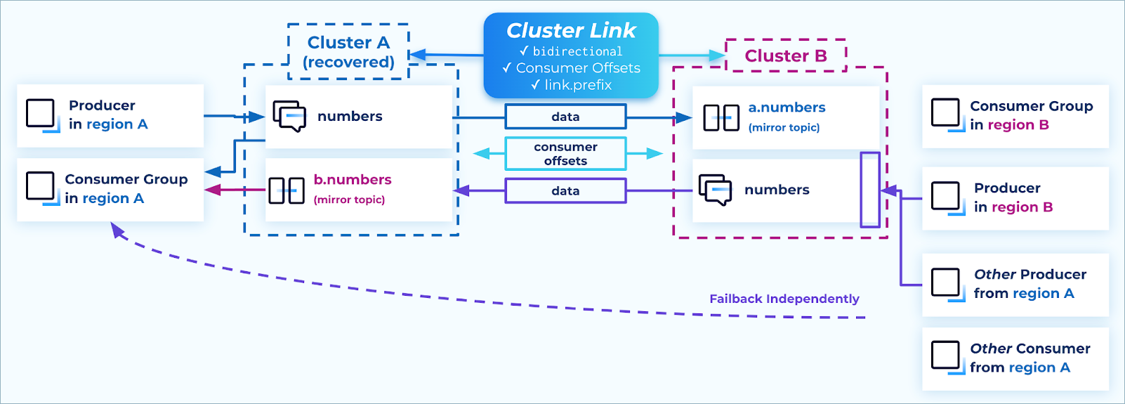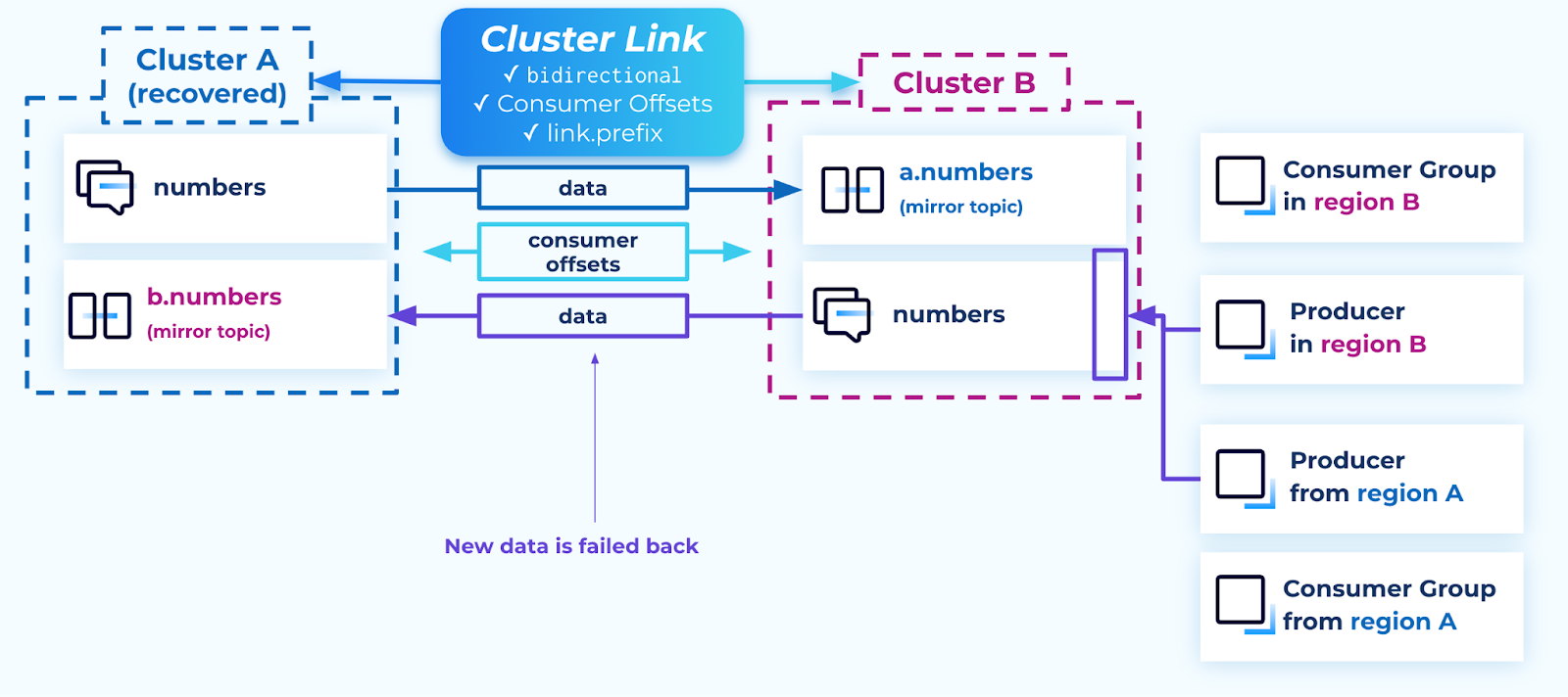 During this process, the primary and secondary clusters and topics will essentially switch places. The original primary topics will become mirror topics and start fetching from the original secondary topics (treating them now as primary). This reinstates the secondary region to ensure redundancy.