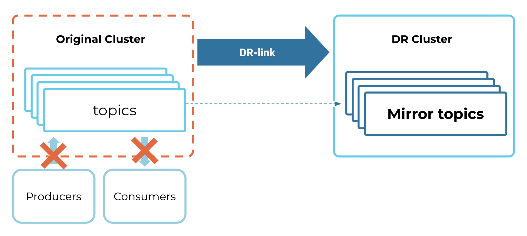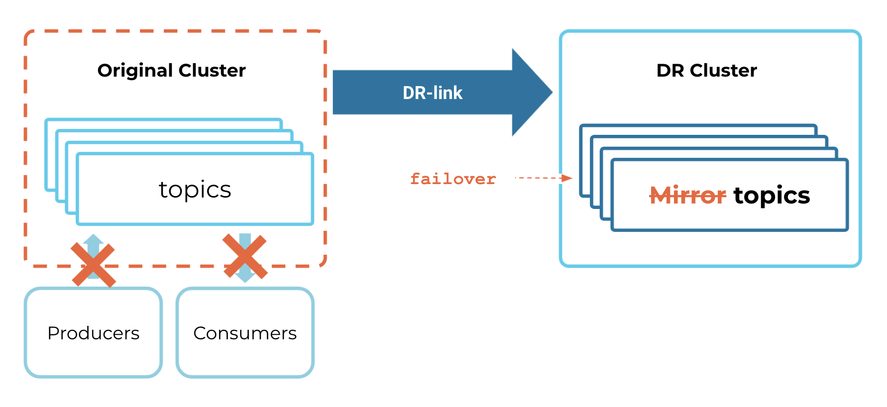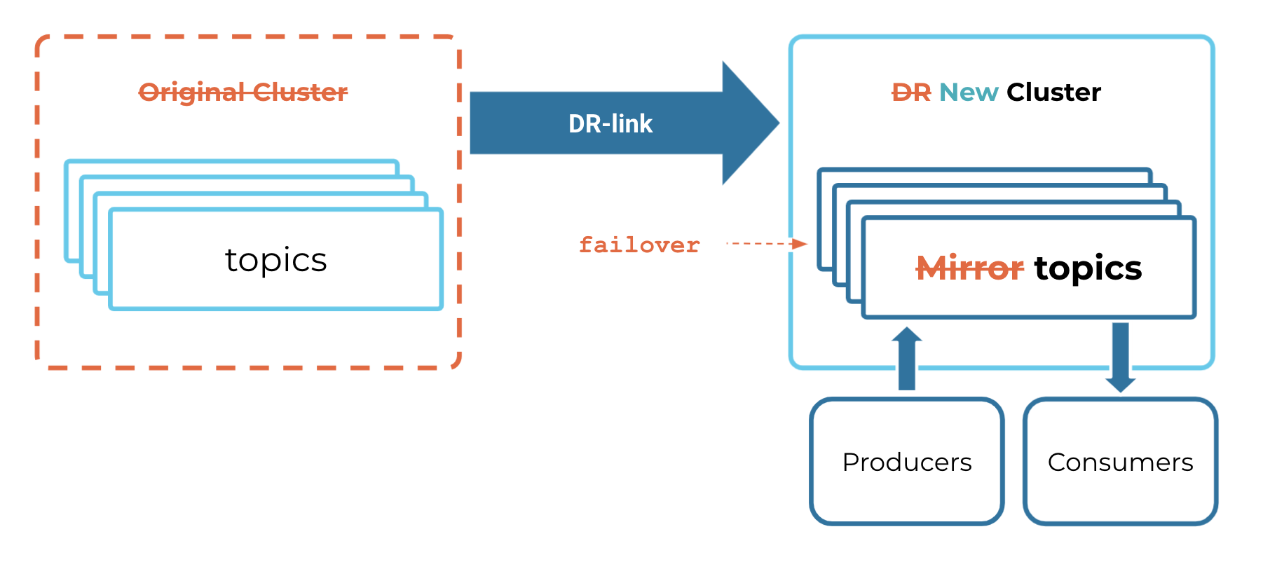 - After you have moved all of your topics, consumers, and producers, restore the DR relationship. To do so, delete the topics on the DR cluster, unpause your cluster link, and recreate the appropriate mirror topics (or let the cluster link auto-create them).