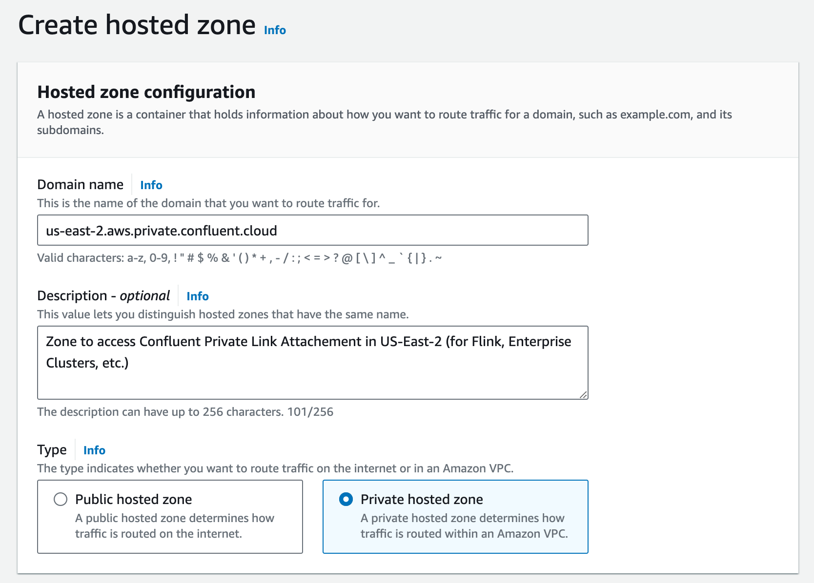 <region>.aws.private.confluent.cloudpattern.In the AWS Route 53 console, create a Route53 Private Hosted Zone: