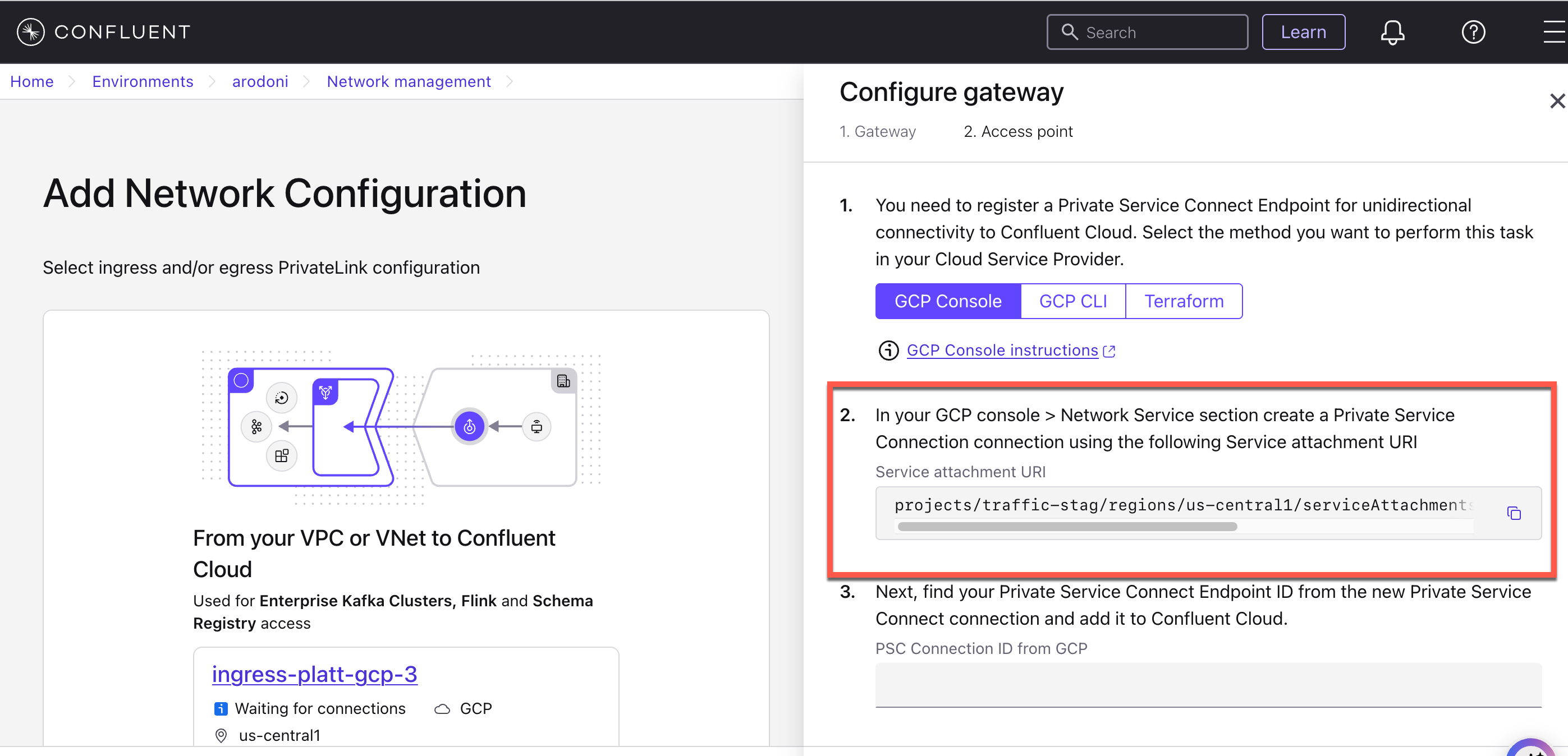 The PrivateLink Attachment resource, referred as the gateway in the Confluent Cloud Console, represents a reservation to establish a Private Service Connect connection from your VPC to regional services in your Confluent Cloud environment.