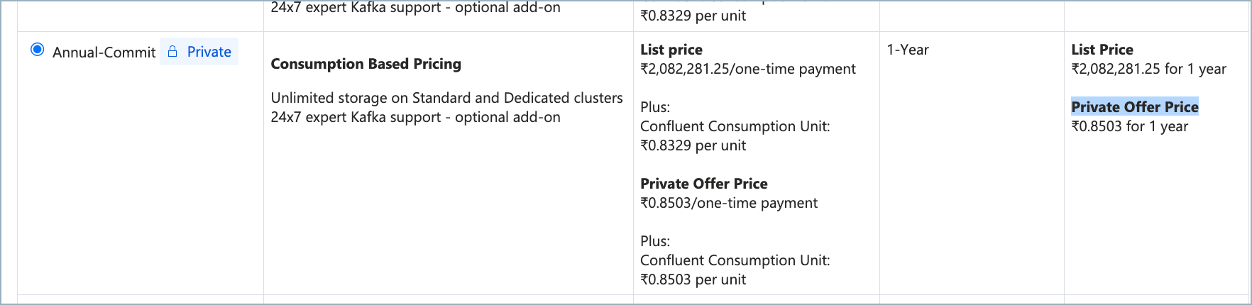 You can view the private offer pricing when selecting the Public Commit. You should also see the Private offer icon for public commit or the plan selected. Please reach out to Confluent support if Private offer icon is not available as your billing might be affected.