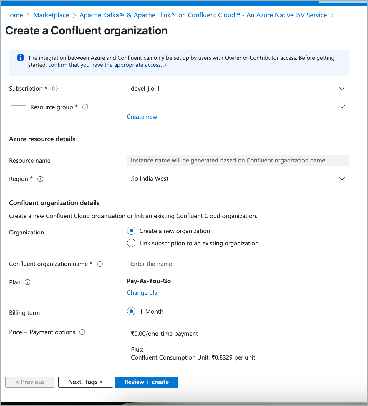 - Your Jio policy should allow you to provision resources in the region where you choose to set up the Confluent resource.