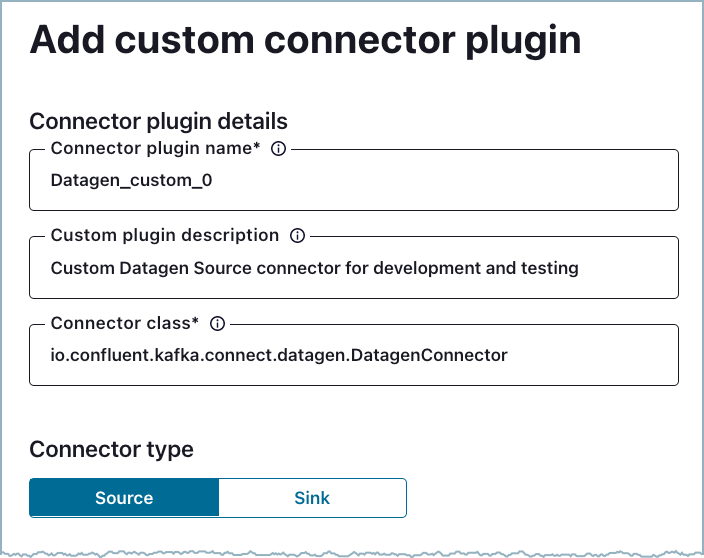 - Connector class: Enter the Java class or alias for the connector. You can get the connector class from the connector documentation provided by the developer. The example in this procedure uses the Datagen Source connector. The class for this connector is shown in the developer documentation.