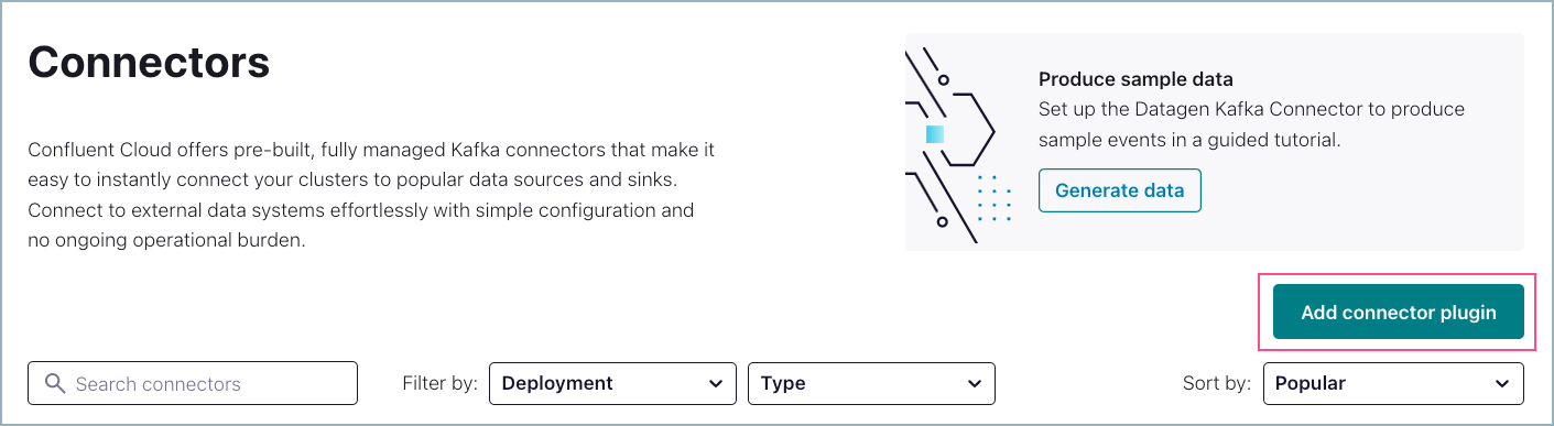 Go to Connectors in your Confluent Cloud cluster. If you have one or more existing connectors, click Add Connector.
