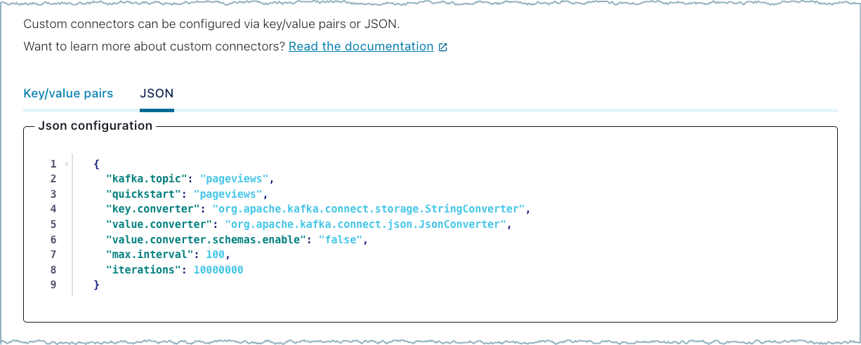 There are two options for entering configuration properties. You can enter each configuration key and value pair or you can add the JSON configuration.