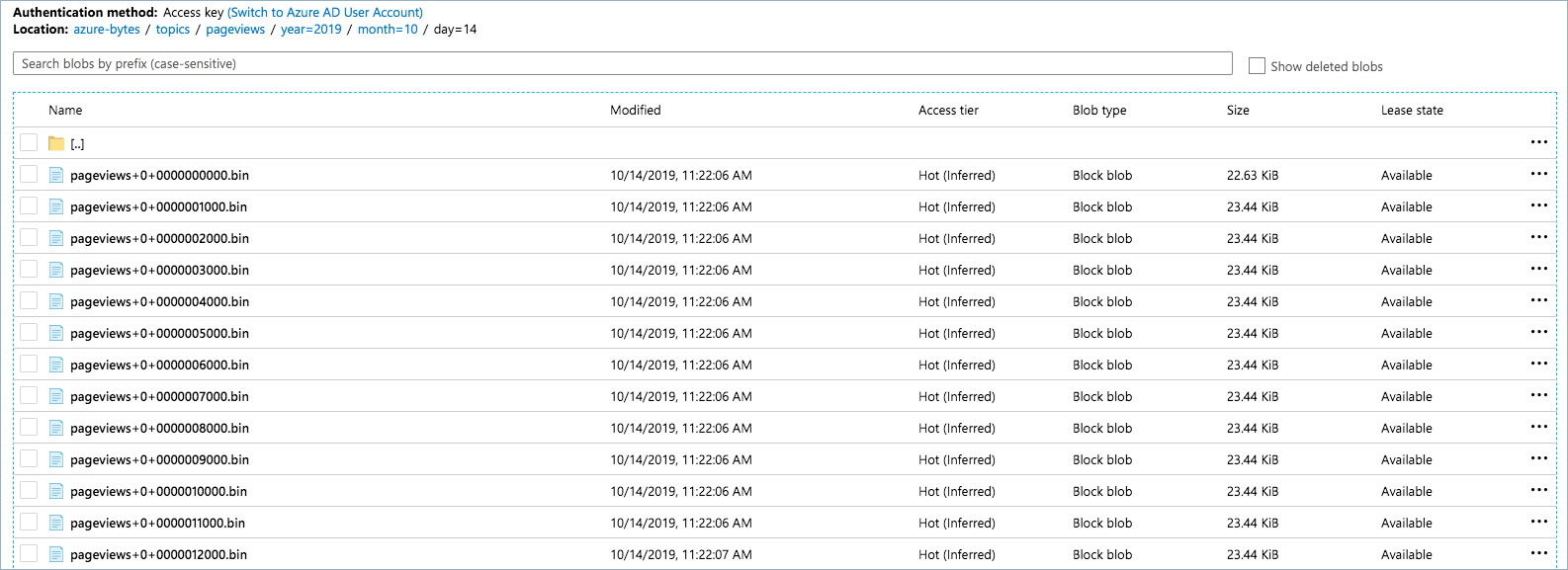 The Azure Blob Storage Sink connector periodically polls data from Kafka and then uploads the data to Azure Blob Storage. The data of every Kafka partition will be split into chunks, where each chunk is represented as an Azure Blob Storage object, using the configured partitioner.