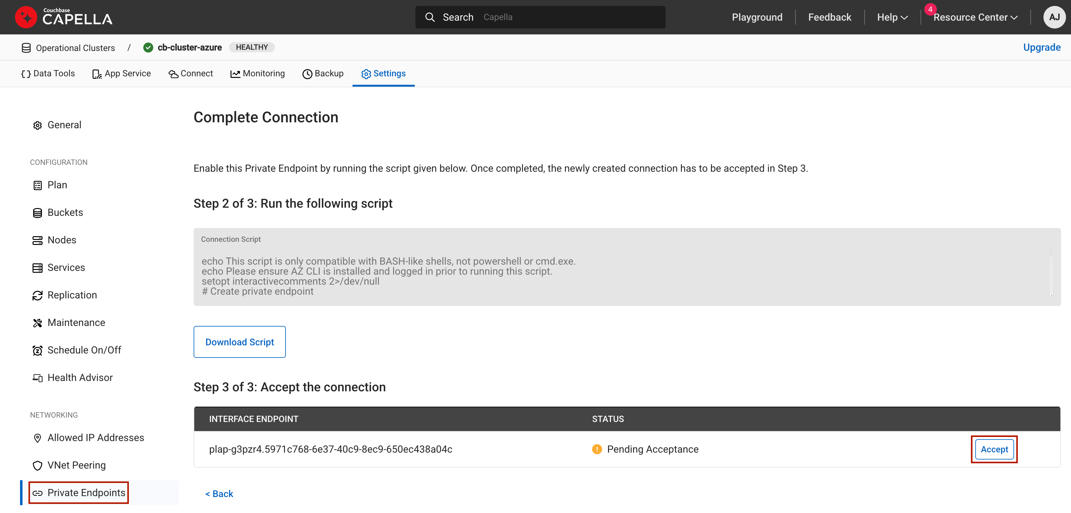 In the Couchbase Capella console, go to previously created Couchbase private endpoint screen.