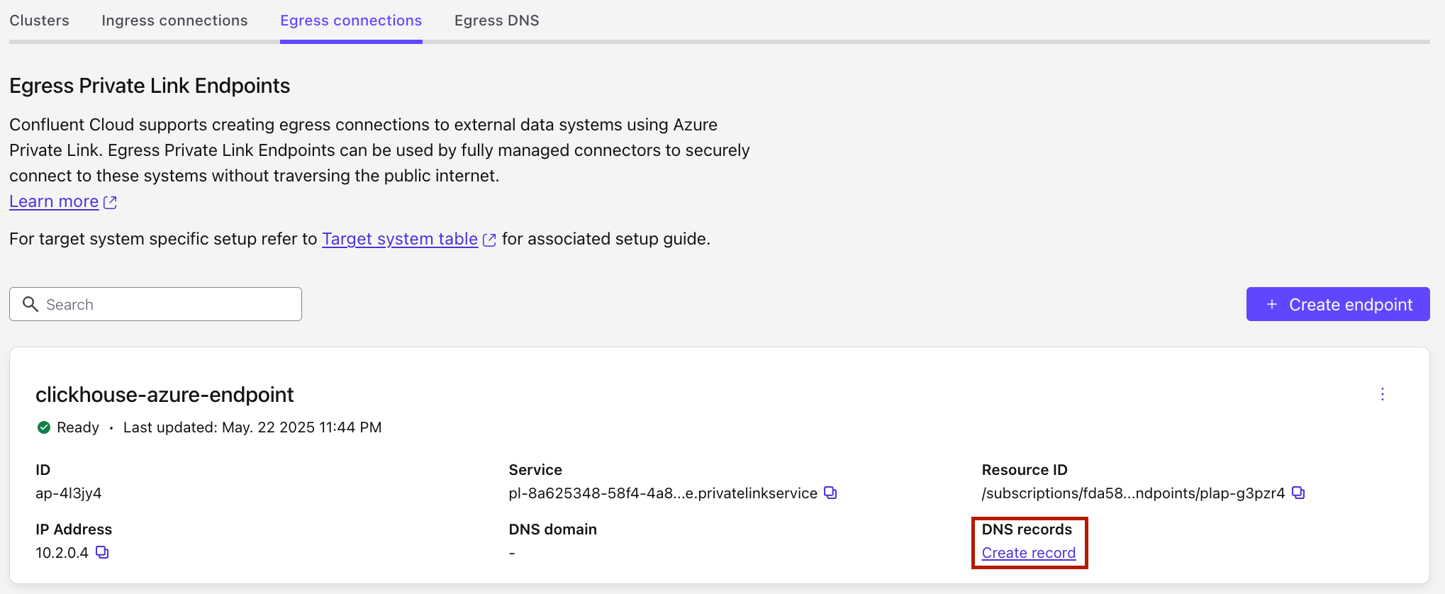 In the Couchbase Capella console, when the Private Link Endpoint status transitions to “Ready”, click Create record on the associated Private Link Endpoint.