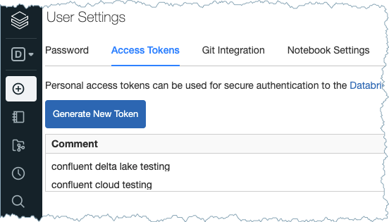 Delta Lake token: You can find the token or generate a new access token. Go to Settings > User Settings > Access Tokens.
