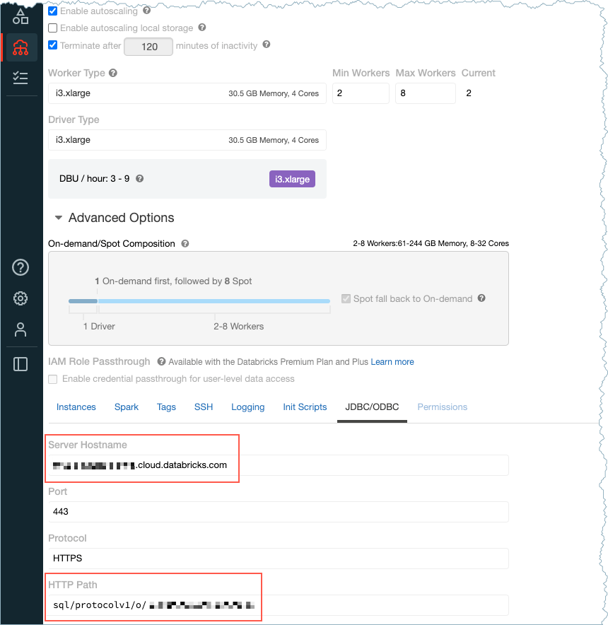 dbc-12345df33-0e53.cloud.databricks.com. The hostname is available on the Databricks Create Cluster page.HTTP path: For example,