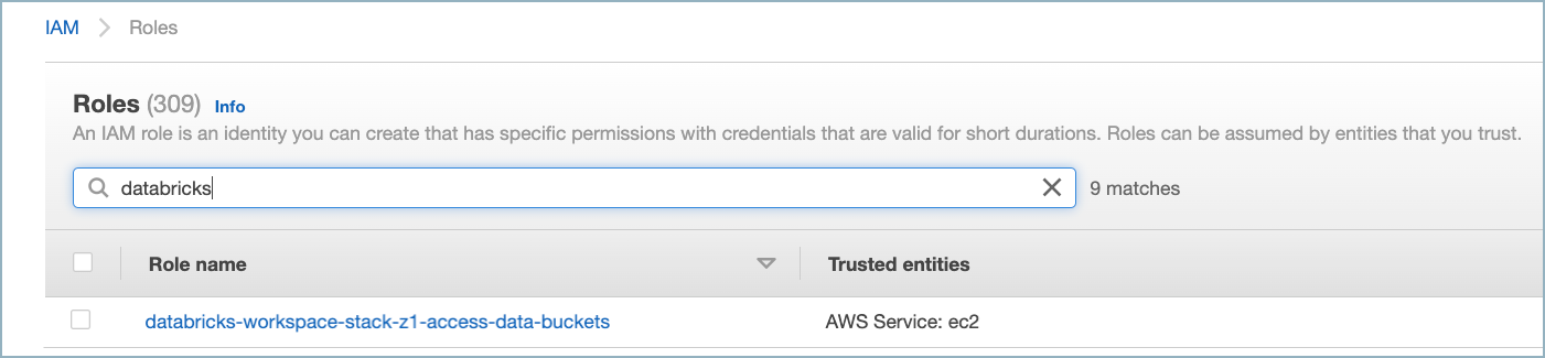 Locate the IAM role used to create the Databricks deployment. To locate the role, click on the Databricks workspace name.