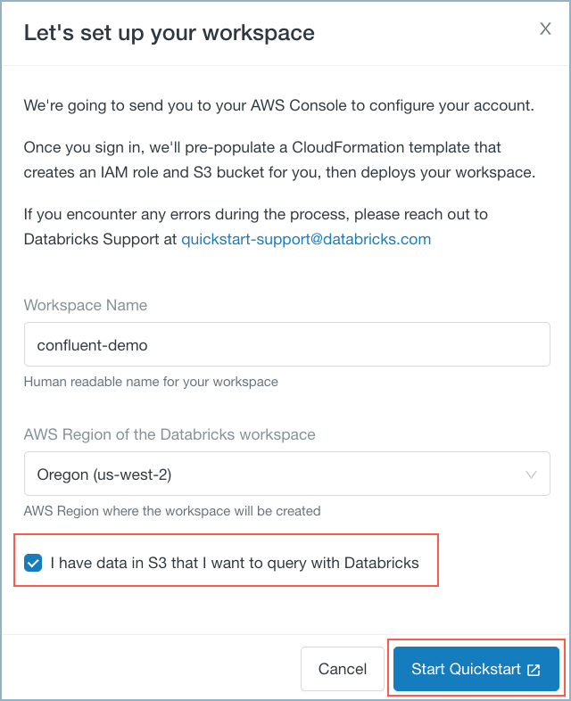 Check the box I have data in S3… and click Start Quickstart.