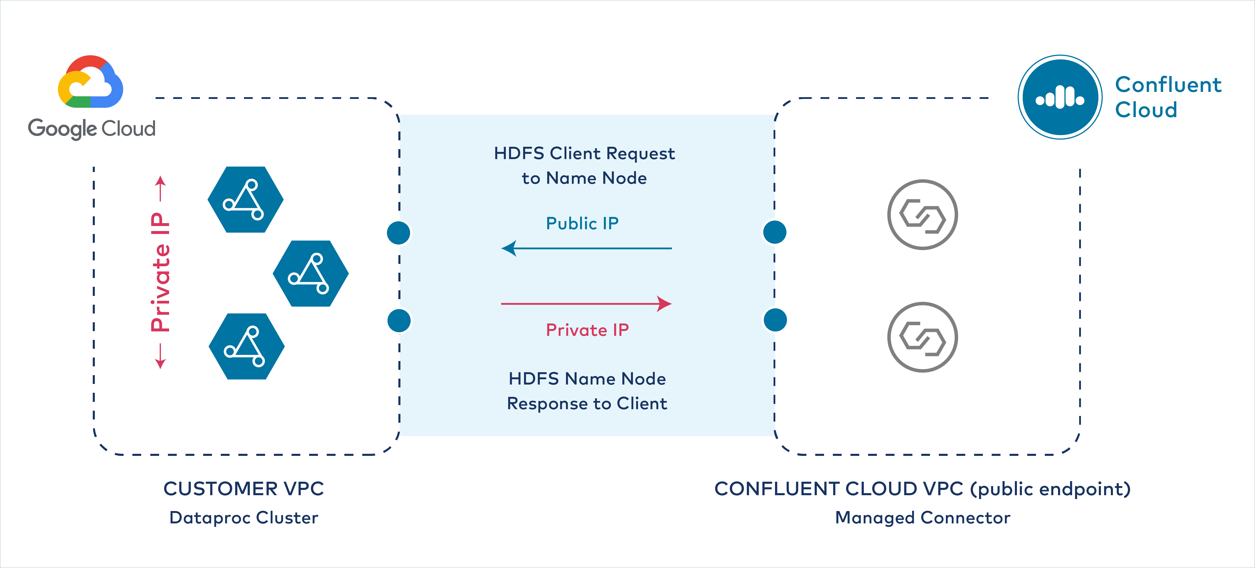 When Confluent Cloud is set up with public endpoints in a non-VPC peering environment, connector requests originate from a public IP endpoint at the Confluent Cloud VPC where the Dataproc connector is running. However, the Dataproc cluster VPC does not provide a public IP address endpoint. Even if each Dataproc node has a Public IP address configured, the VPC does not, and the Hadoop daemon returns private IP addresses and private hostnames to the Confluent Cloud connector.