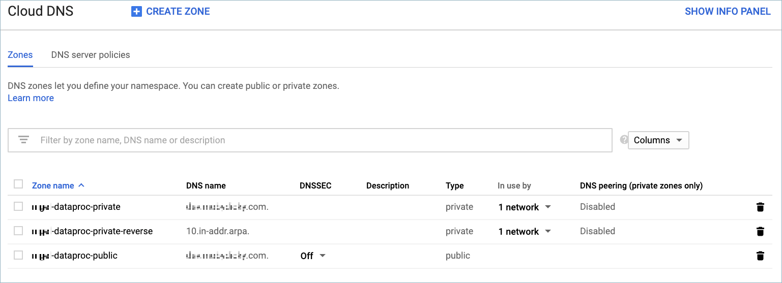 - public zone: Contains record sets corresponding to the external IP addresses of each Dataproc cluster node.