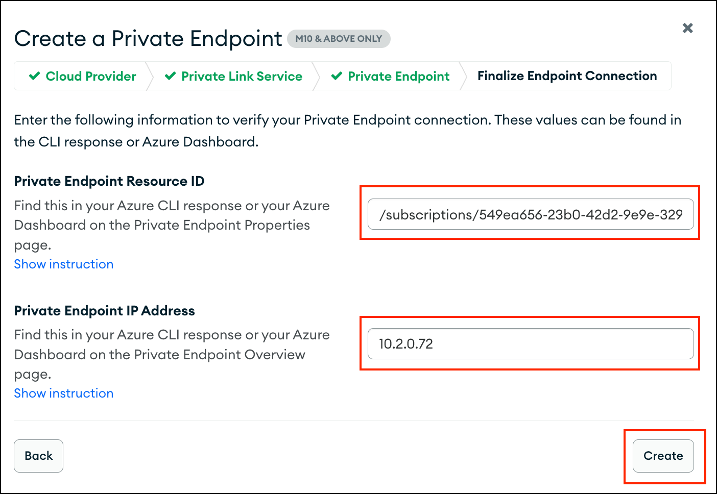 Specify the Endpoint Resource ID and Private Endpoint IP Address associated with your Confluent Cloud Egress Private Link Endpoint. Click Create.