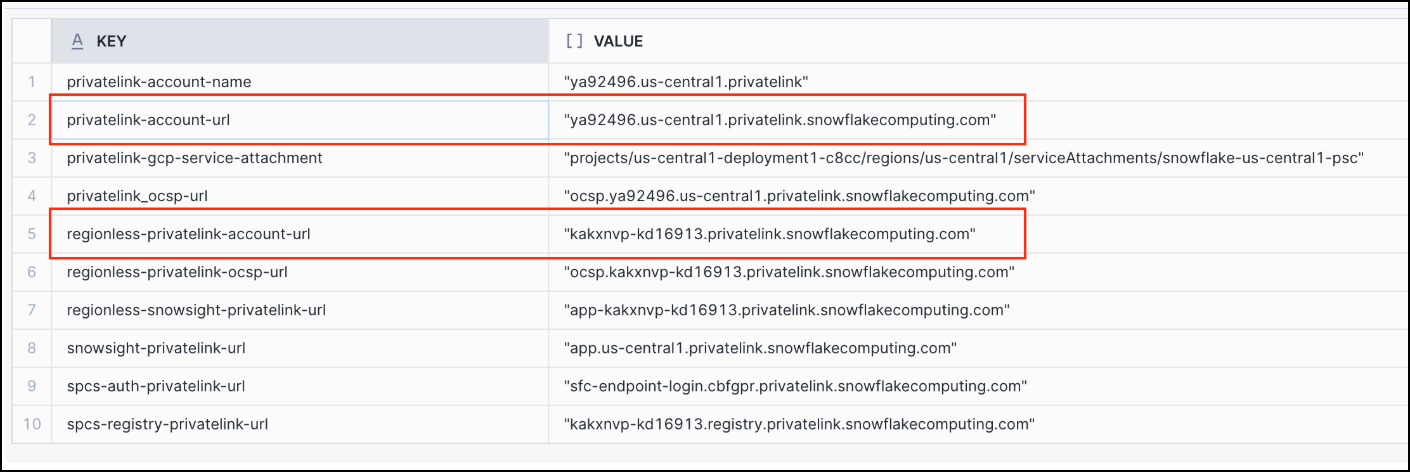 FROM TABLE(FLATTEN(INPUT=>PARSE_JSON(SYSTEM$GET_PRIVATELINK_CONFIG())));