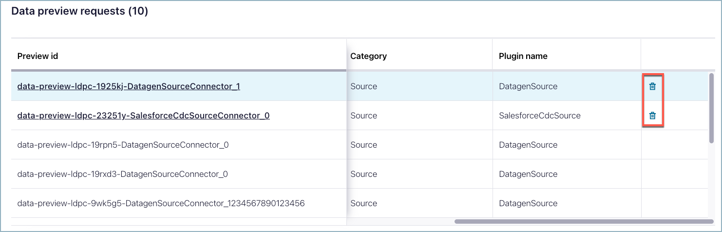 data-preview-ldpc-<id>(in your Kafka cluster). This topic is deleted when you click the delete icon next to the preview listing.