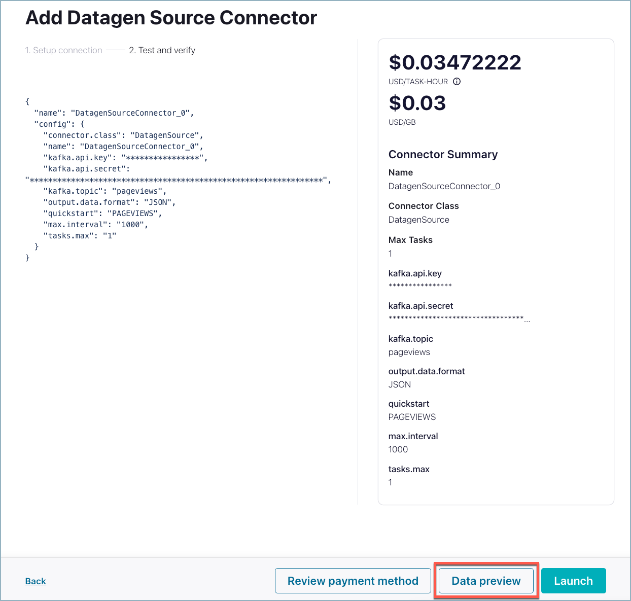 Connector failed to provisionis displayed. You can retry the preview request or launch the actual connector. - Previewed records are stored in a separate data preview output topic named