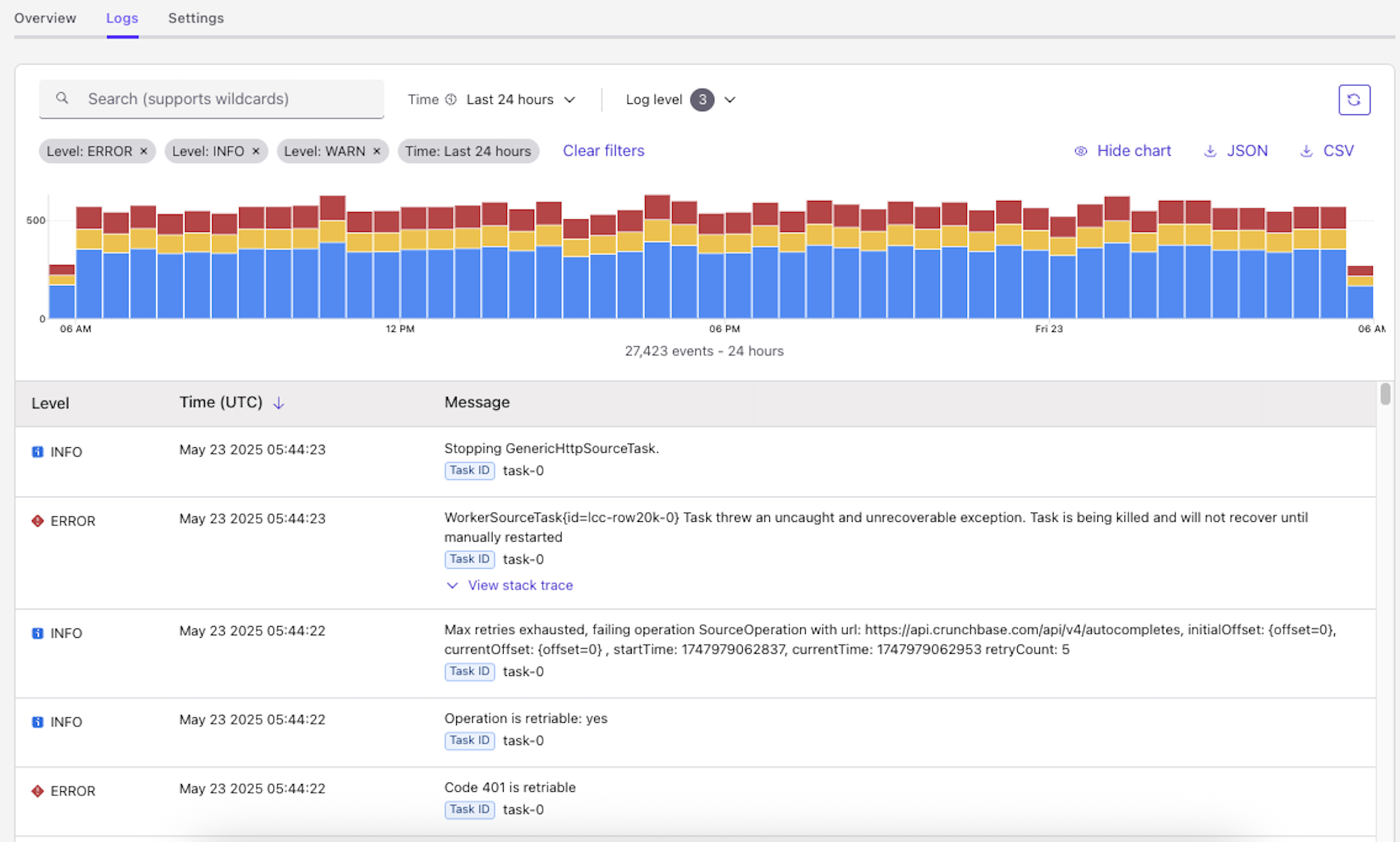 Found 2 log entries for connector lcc-123456: Timestamp | Level | Task ID | Message | Exception ---------------------------+--------+---------+-----------------------------------+------------------------------------------------------ 2025-02-01T00:00:00.757Z | ERROR | task-0 | WorkerSourceTask{id=lcc-123456-0} | org.apache.kafka.connect.errors.ConnectException: ... | | | Task threw an uncaught and | | | | unrecoverable exception. Task is | | | | being killed and will not recover | | | | until manually restarted | 2025-02-01T00:00:00.761Z | ERROR | task-0 | WorkerSourceTask{id=lcc-123456-0} | org.apache.kafka.connect.errors.ConnectException: ... | | | Task threw an uncaught and | | | | unrecoverable exception. Task is | | | | being killed and will not recover | | | | until manually restarted |