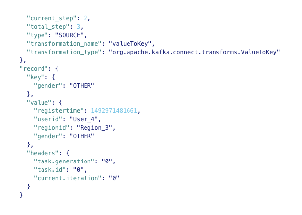 The first record is the actual source record received by the connector. No transformations are applied yet.