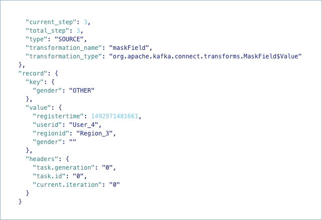 MaskField$Value) is applied to the Kafka record. The Kafka record value is transformed and thegenderfield value is removed.