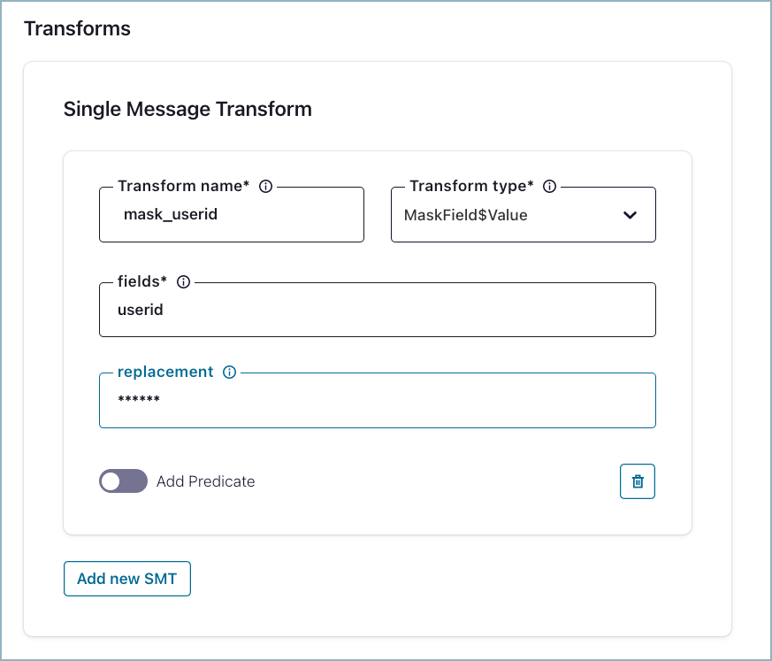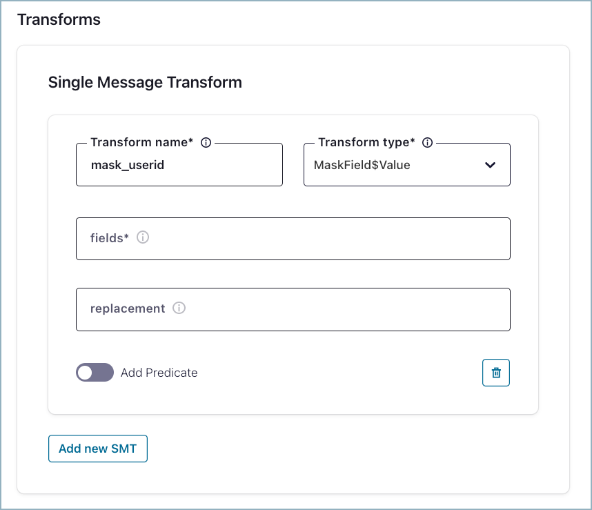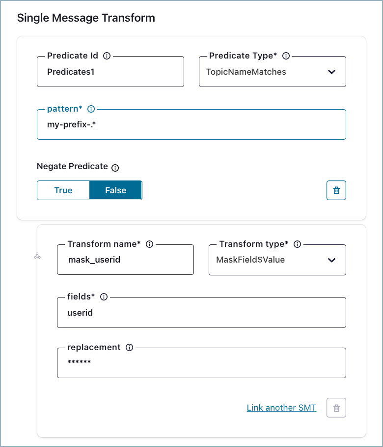 When you create a predicate, the predicate is linked to the first transform it was created from. You can link additional SMTs to use the same predicate. When you delete a predicate, you have the option to keep transforms linked to the predicate, or delete the predicate and any linked transforms.