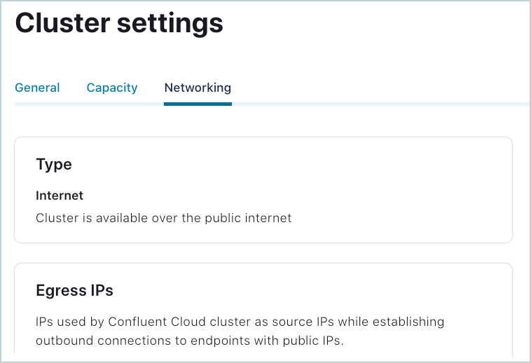 For additional information about using a set of public egress IP addresses in Confluent Cloud, see Use Public Egress IP Addresses on Confluent Cloud for Connectors and Cluster Linking.