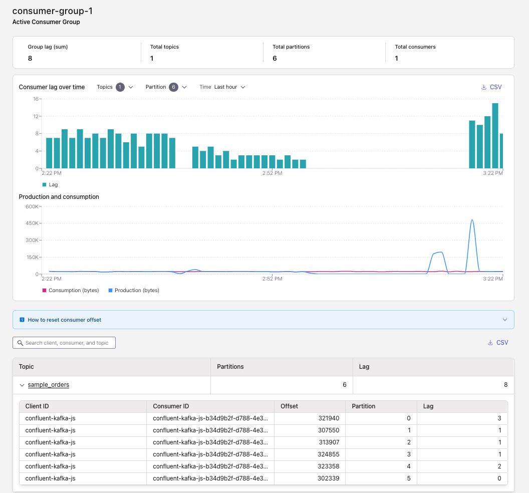 - The consumer group list displays information about your consumer groups, including the group ID, status, and protocol. You can also find values for group lag, and number of consumers, topics, and partitions. For more information, see Kafka Consumer for Confluent Cloud.