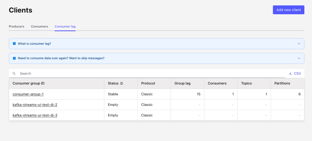 Choose Clients and select Consumer Lag. A list of consumer groups displays.