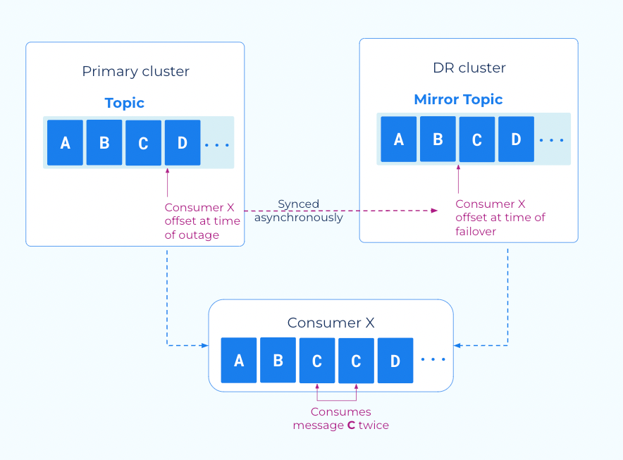 Because consumer offset sync is asynchronous, when an outage or disaster occurs, the most recent consumer offsets may not have been committed to the destination cluster, yet. So, when your consumer applications begin consuming on the destination cluster, the first few messages they receive may be messages they have already received. Consumer applications must be able to tolerate these duplicates on a failover.