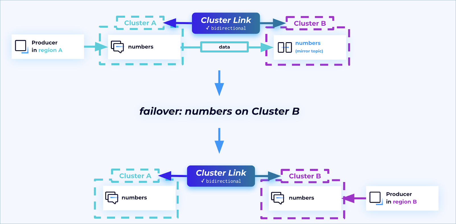 During this process, the primary and secondary clusters and topics will essentially switch places. The original primary topics will become mirror topics and start fetching from the original secondary topics (treating them now as primary). This reinstates the secondary region to ensure redundancy.