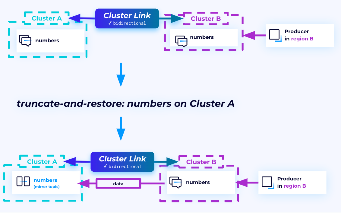 Using the Cluster Linking truncate-and-restore command, a DR workflow can be completed with: