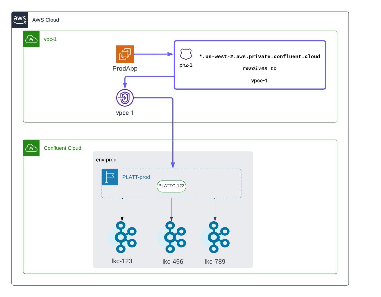 ProdApp-1attempts to accesslkc-123in the env-prod environment. A DNS query forlkc-123.us-west-2.aws.private.confluent.cloudresolves againstphz-1and returnsvpce-1.ProdApp-1sends traffic tovpce-1.vpce-1forwards traffic toPLATT-abc, andlkc-123can be accessed sincePLATTC-123is associated withvpce-1.ProdApp-2attempts to accesslkc-456in the env-prod environment. A DNS query forlkc-456.us-west-2.aws.private.confluent.cloudresolves againstphz-2and returnsvpce-2.ProdApp-2sends traffic tovpce-2.vpce-2forwards traffic toPLATT-abc, andlkc-456can be accessed sincePLATTC-456is associated withvpce-2.
