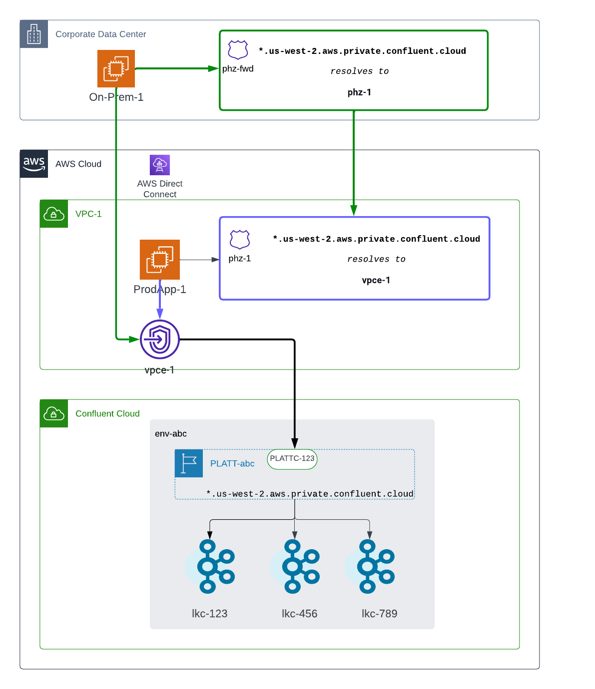 On-Prem-1attempts to accesslkc-123in the env-abc environment. A DNS query forlkc-123.us-west-2.aws.private.confluent.cloudforwards tophz-1and returnsvpce-1.On-Prem-1sends traffic tovpce-1over AWS DirectConnect.vpce-1forwards traffic toPLATT-abcandlkc-123can be accessed sincePLATTC-123is associated withvpce-1.
