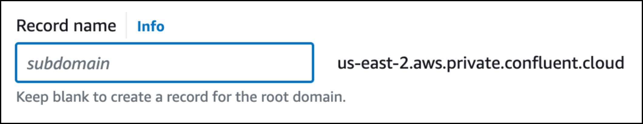*as the subdomain name.The Record name consists of the subdomain and the DNS domain name. The DNS domain name is filled in with the Confluent Cloud DNS domain value you specified when you created the Route53 Private Hosted Zone in the previous step.