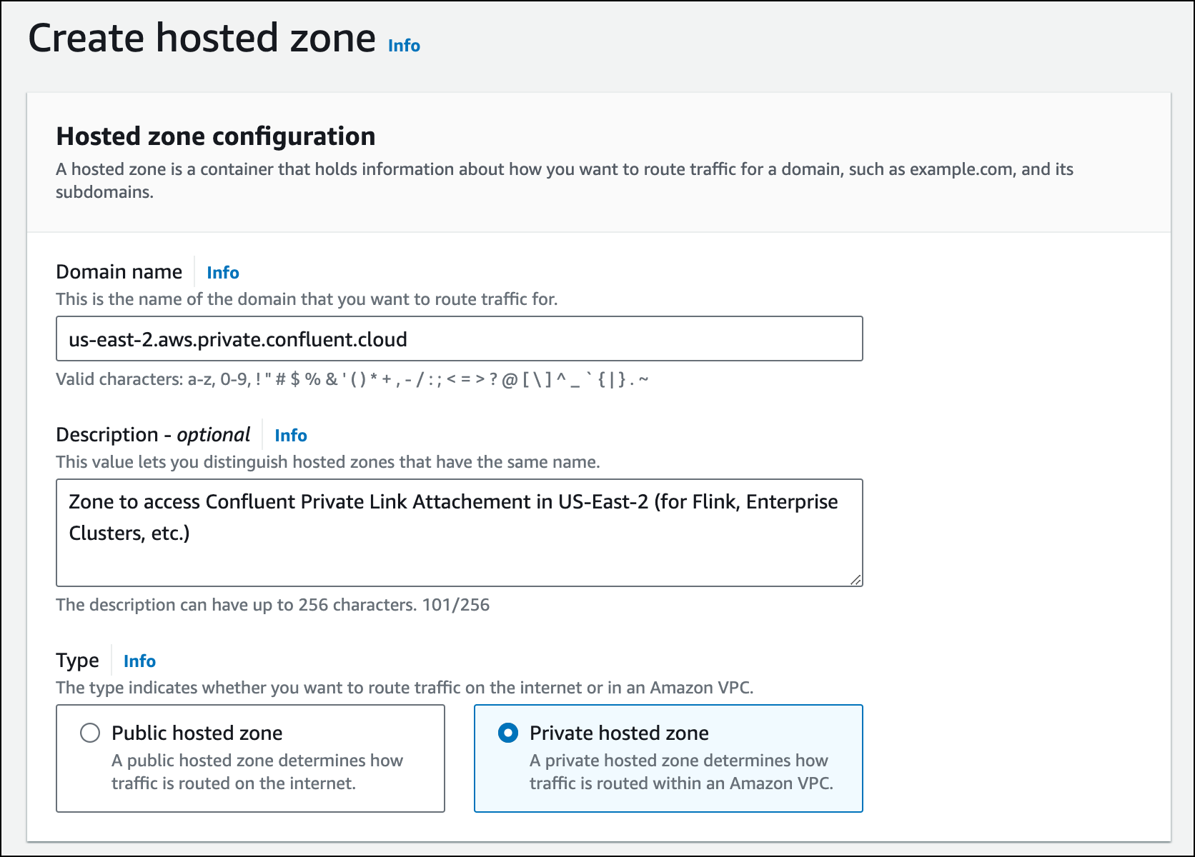 <region>.aws.private.confluent.cloudpattern.In the AWS Route 53 console, create a Route53 Private Hosted Zone: