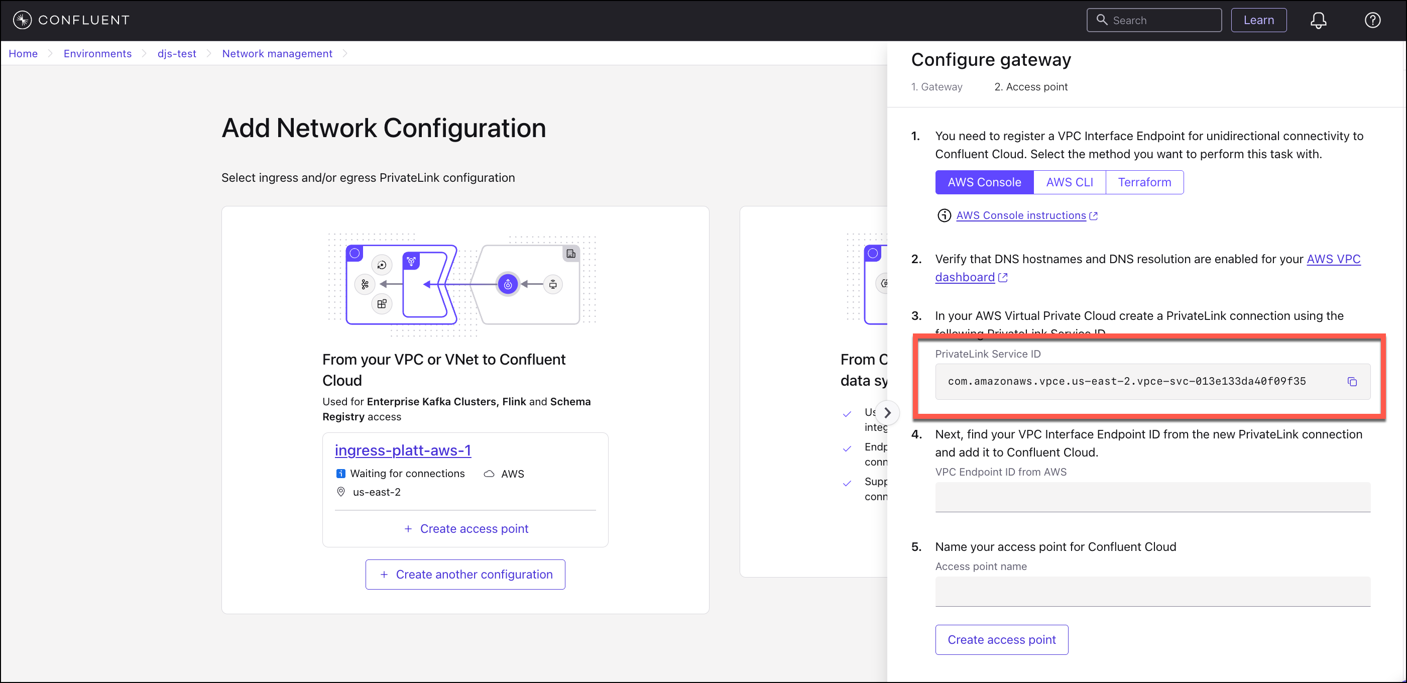 To use all features of the Confluent Cloud Console with AWS PrivateLink, see Use the Confluent Cloud Console with Private Networking.