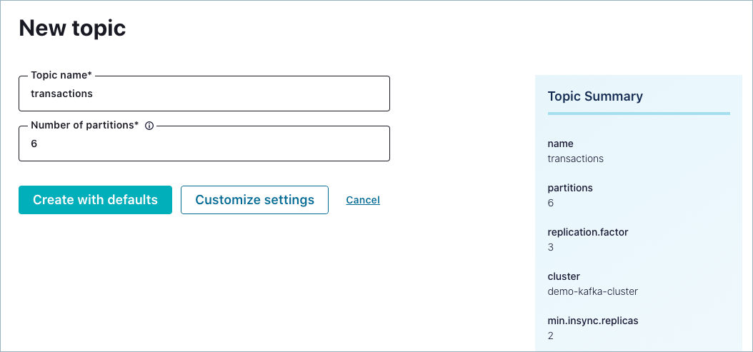 For the exercises in this tutorial, you will be producing to and consuming from a topic called transactions. Create this topic in Confluent Cloud UI.