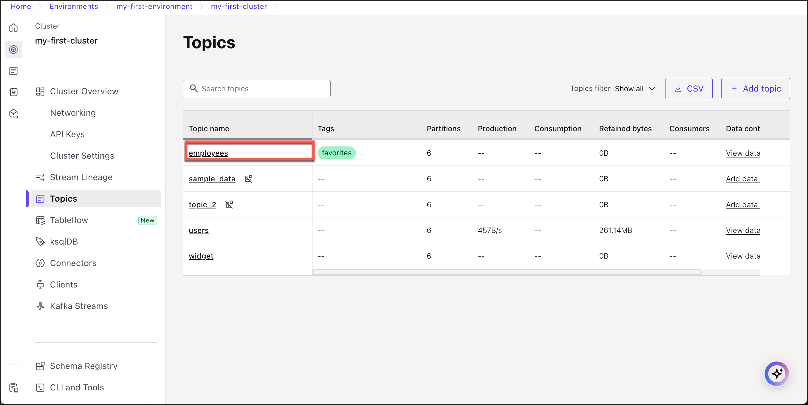 From the navigation menu in a cluster, click Topics, then click a topic to select it (or create a new one).
