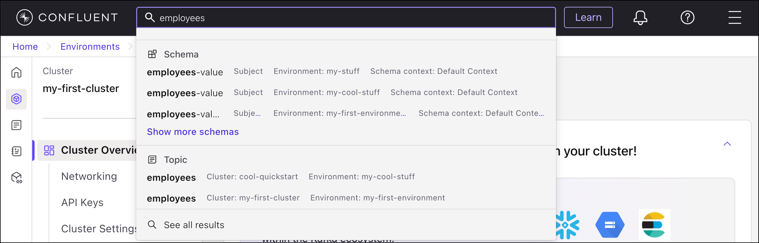 You can also find and view schemas by searching for them. Searches are global; that is, they span across environments and clusters.