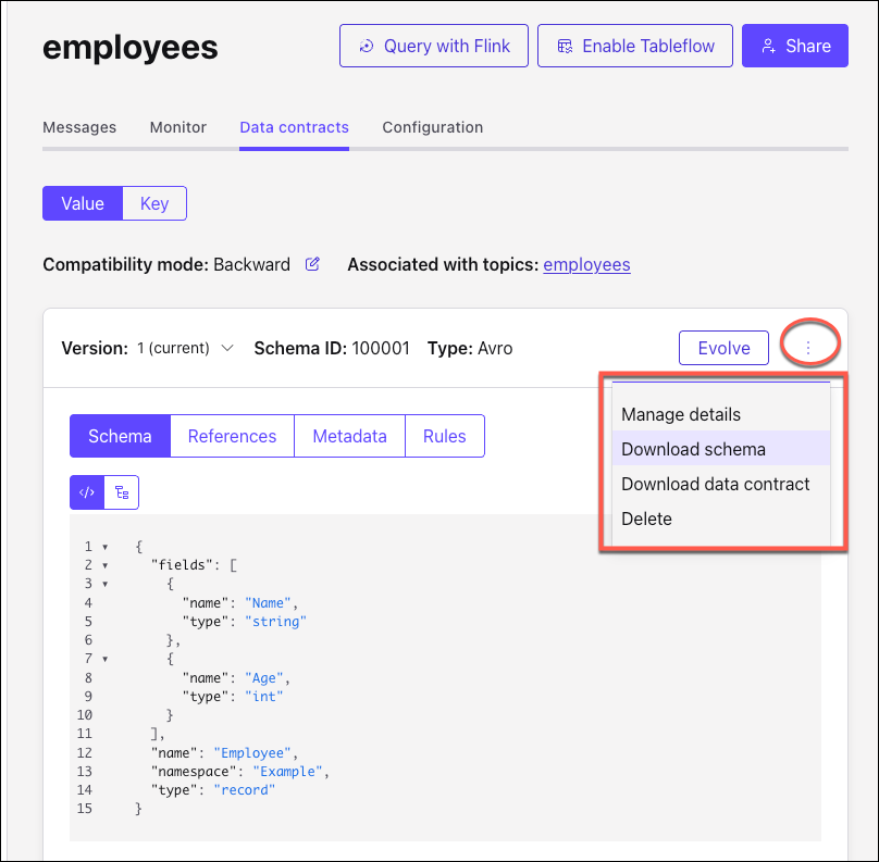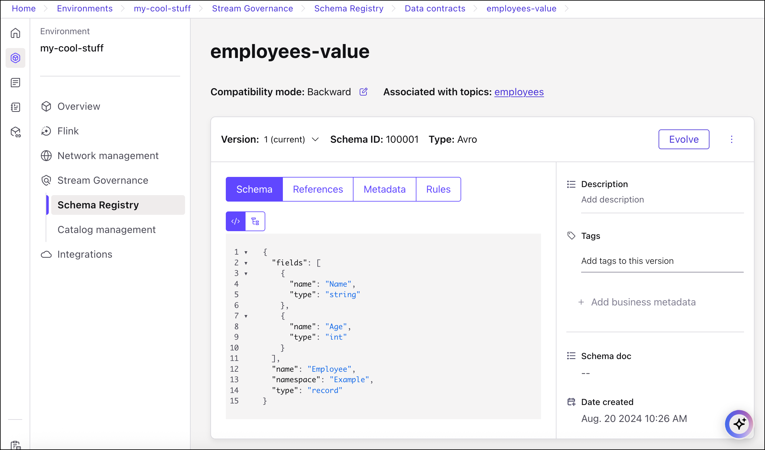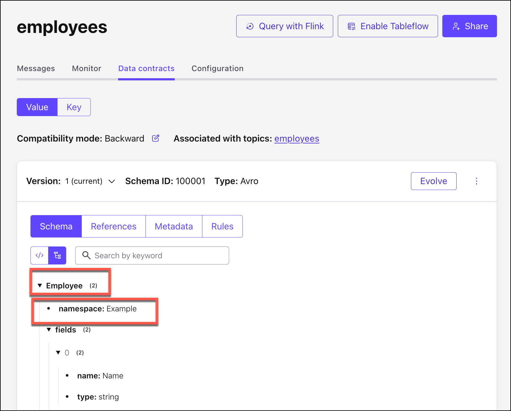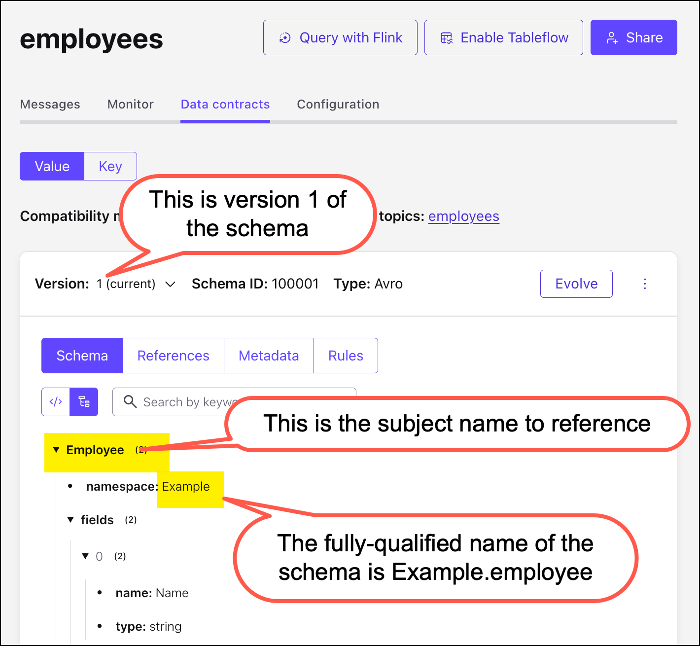 For example, to create a reference to the Avro schema for the value schema for the employees topic (Schema name employees-value)